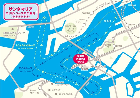 天保山ハーバービレッジ内、海遊館西はとばより出航。クルーズ前や後に海遊館や天保山大観覧車を楽しむのもおすすめです。