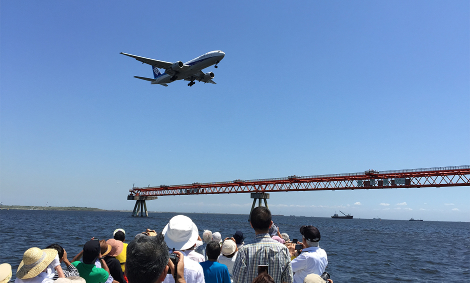 - 最近話題になっている、羽田空港に離発着する飛行機を船から見るクルーズです。